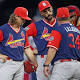 STLtoday.com St. Louis Cardinals pitching coach Derek Lilliquist visits starting pitcher Mike Leake, left, as Matt Carpenter, center, and catcher Yadier Molina, right rear, listen in during the first inning of the Little League Classic baseball game against the ... |